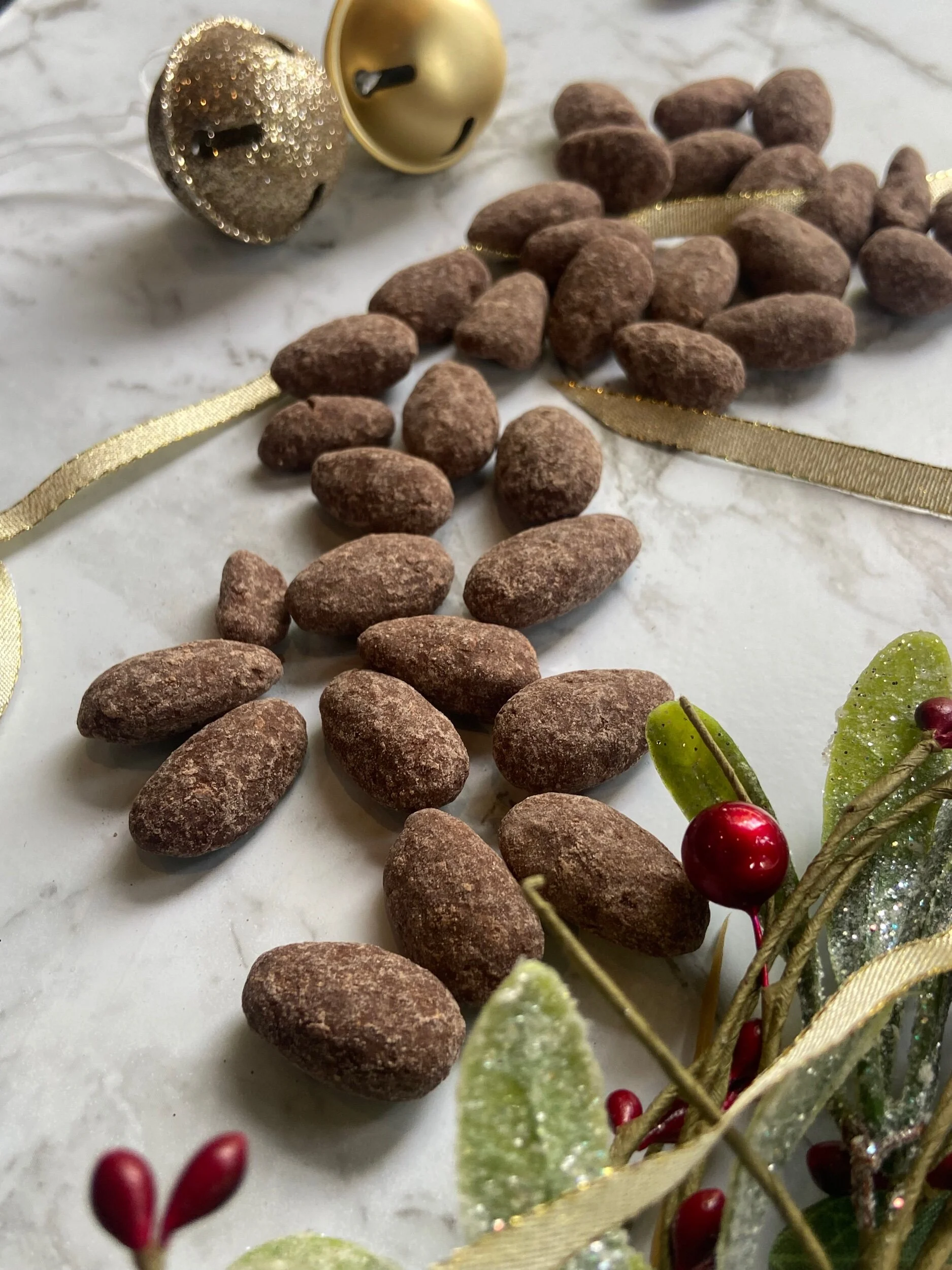 Roasted Almonds, panned by hand in our custom 48.5% dark milk chocolate, heavily spiked with our delicious Gingerbread spices.